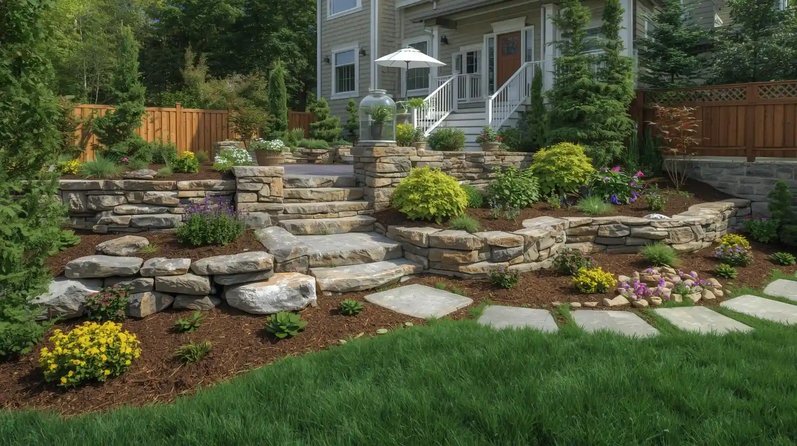 Hillside properties also offer opportunities for stunning terraced gardens, retaining walls that double as seating, and dramatic landscape features that take advantage of elevation changes. We know how to turn challenging terrain into your property’s best feature.